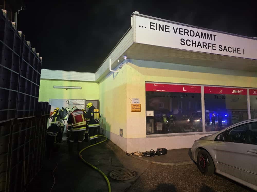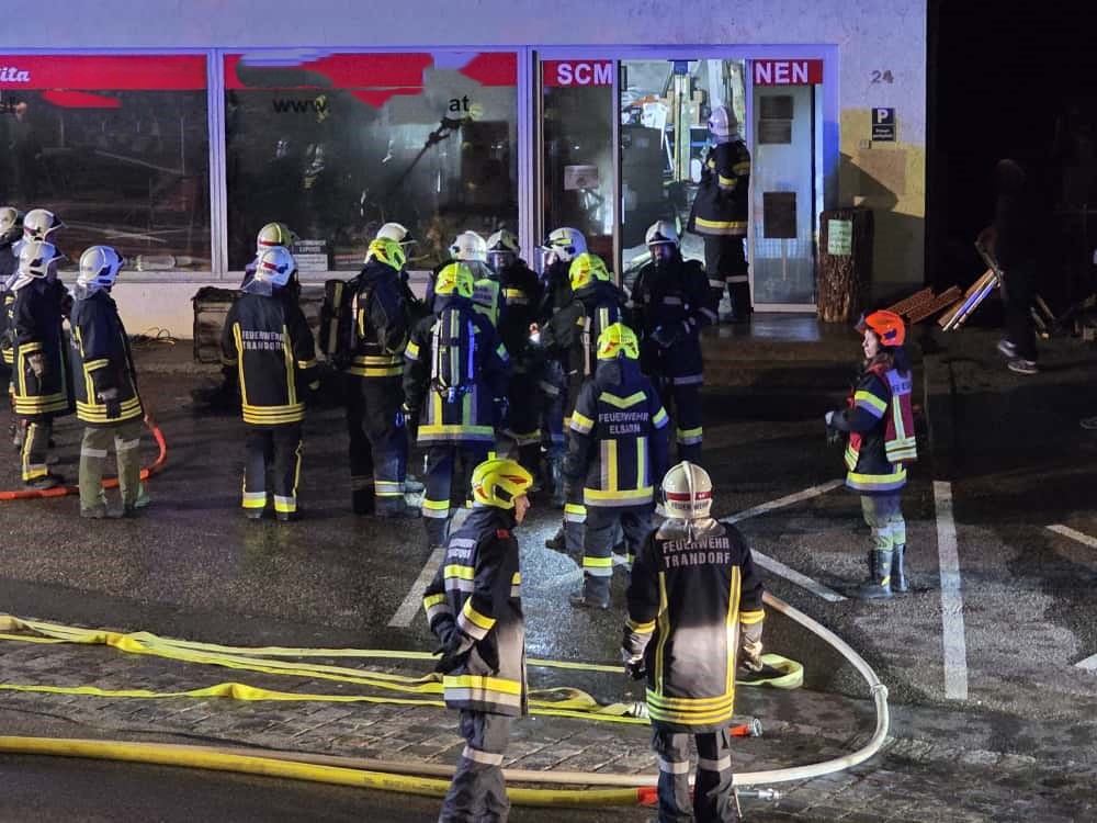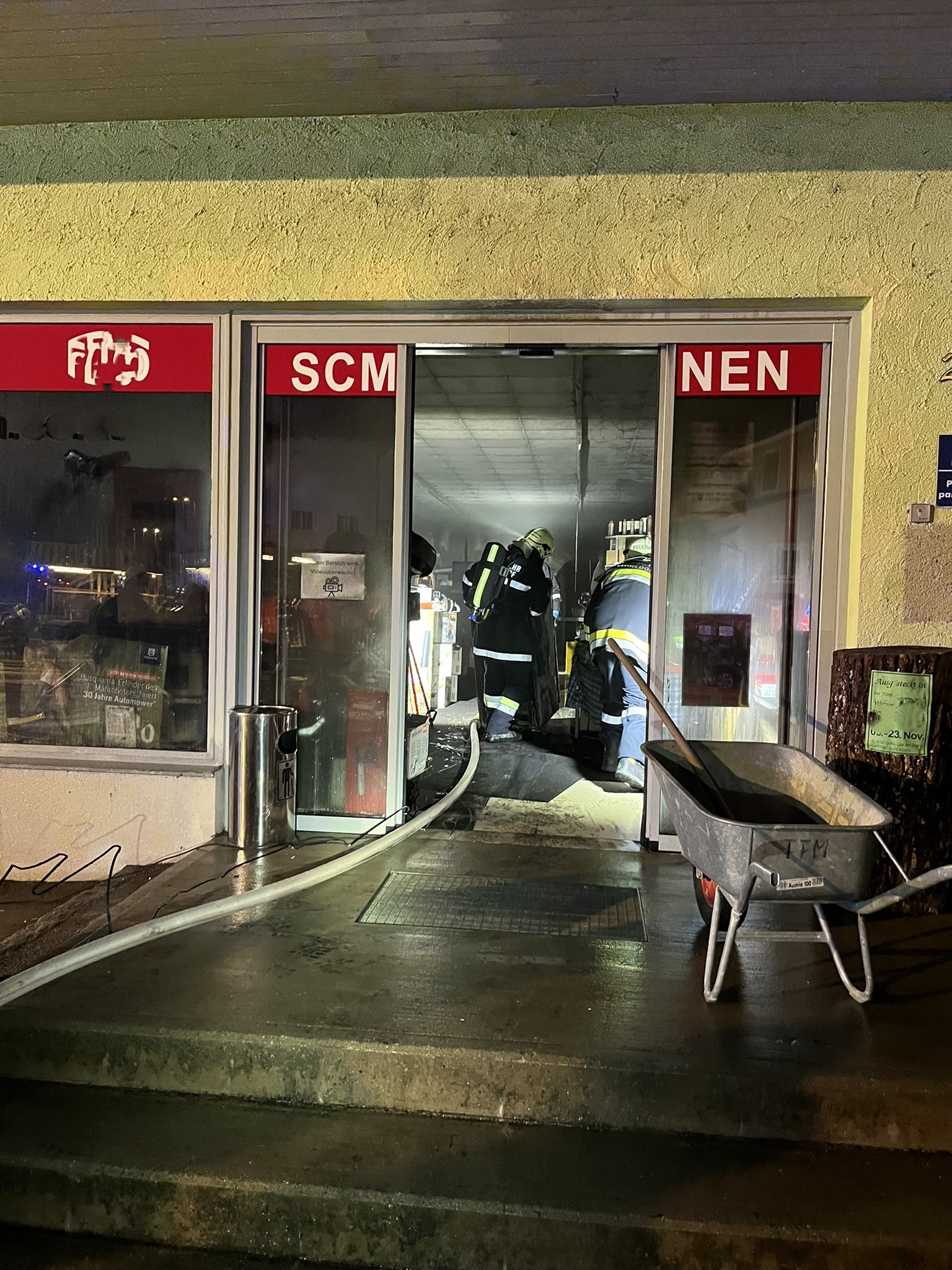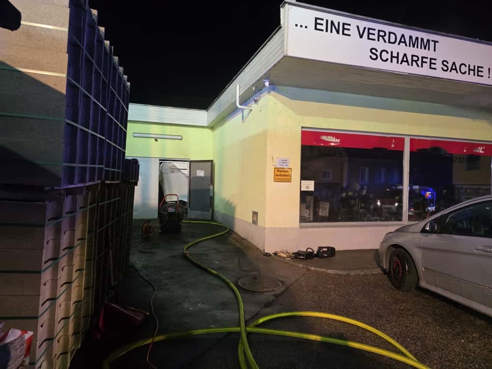 Da die Hitzeentwicklung im Verkaufsbereich bereits deutlich fortgeschritten war, wurde – um die Gefahr eines Flashovers zu vermeiden – bewusst darauf verzichtet, die Eingangstüre aufzuschlagen. Stattdessen erfolgte der Erstangriff über eine Nebentüre im ehemaligen Lagerbereich.