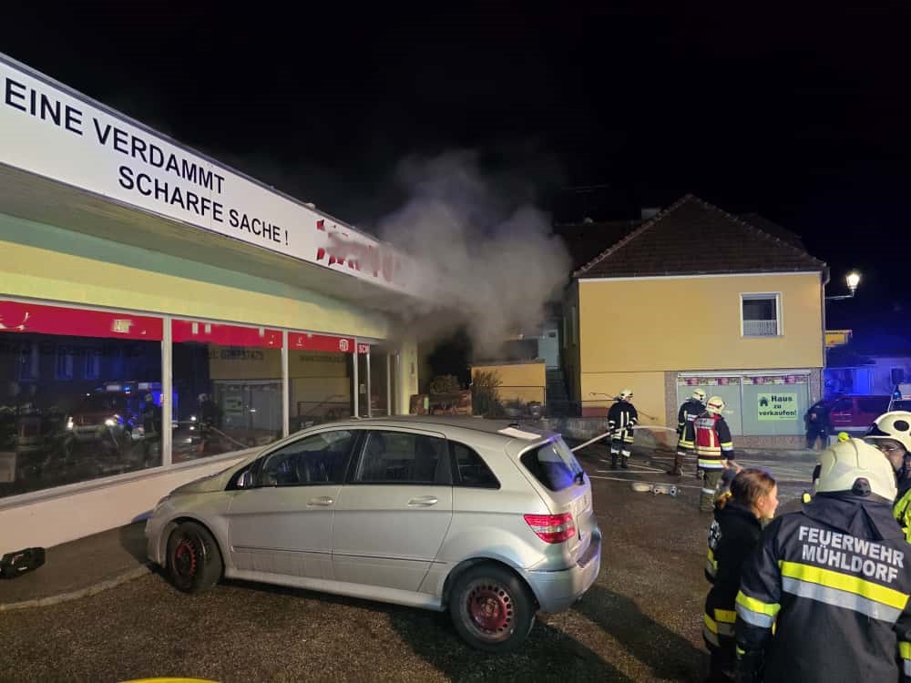 Der erste Atemschutztrupp (FF Mühldorf) suchte im stark verrauchten und bereits sehr heißen Verkaufsraum nach dem Brandherd. Nachdem sichergestellt war, dass sich das Feuer nicht im Verkaufsraum befand, wurde die Haupteingangstüre geöffnet und der Bereich mittels Druckbelüfter entraucht.
