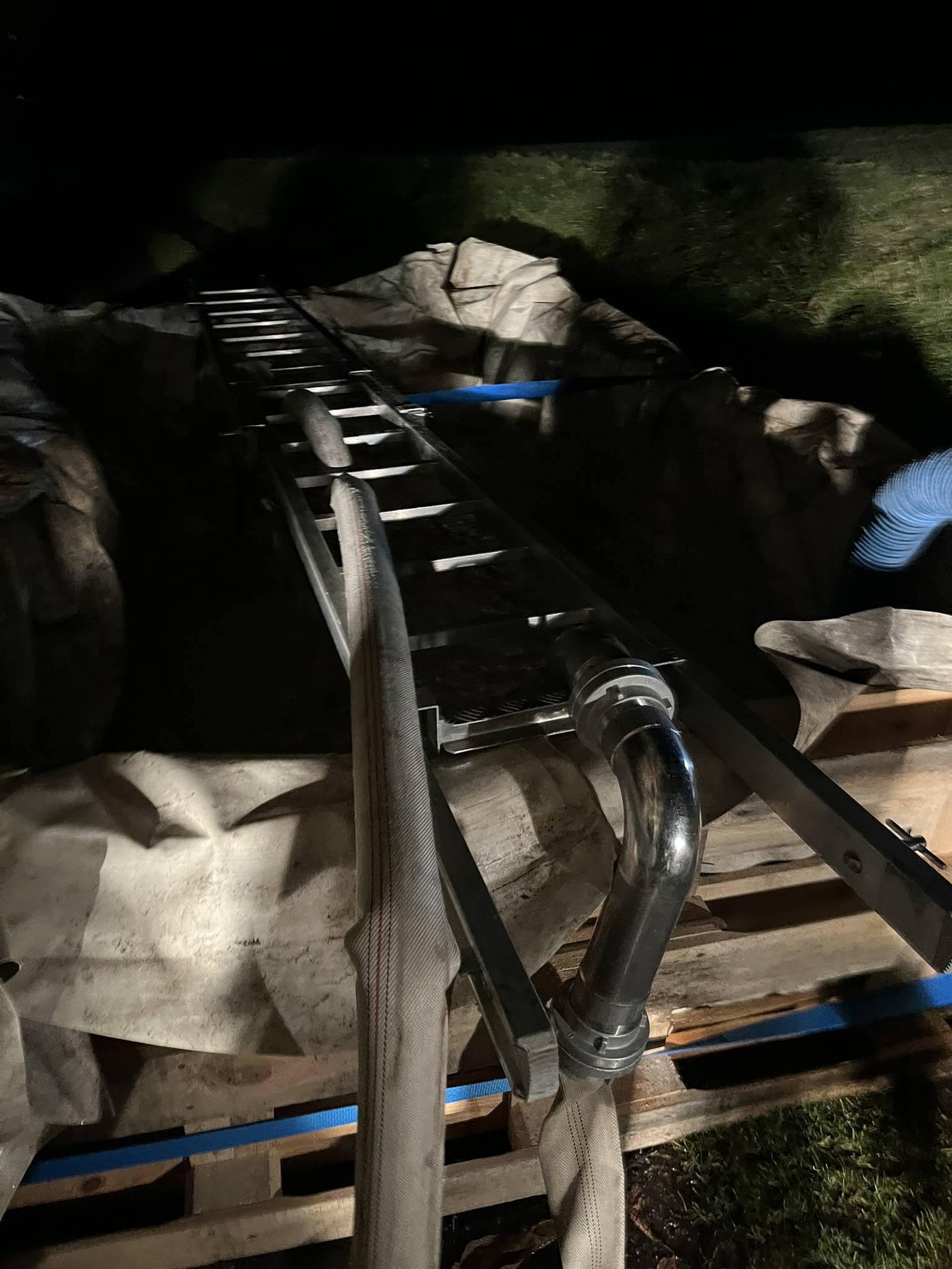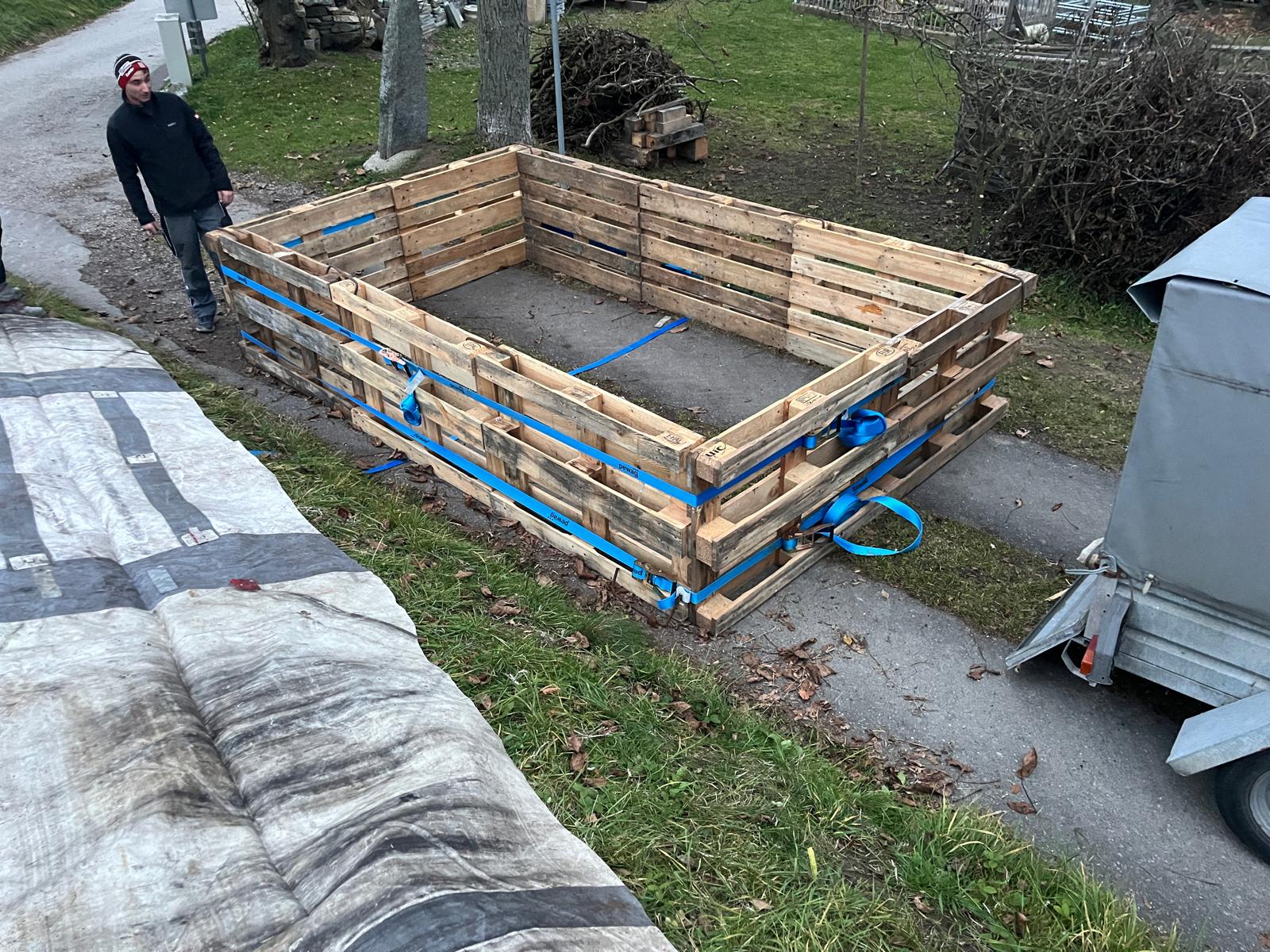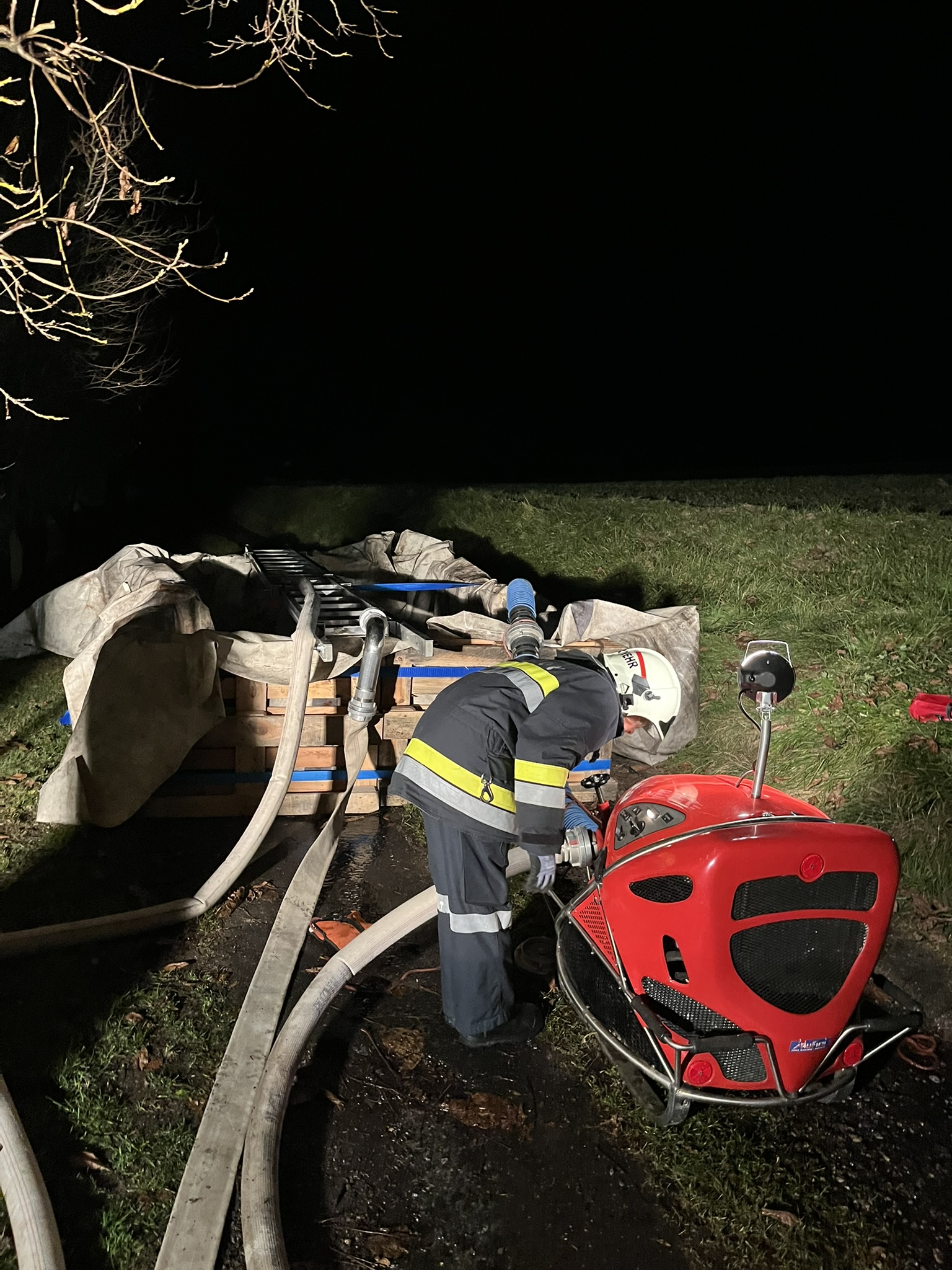 Pumpe Mühldorf errichtete ein großes Sammelbecken aus Europaletten und einer Plane und versorgte aus diesem rund 7 m³ fassenden Becken die beiden Tanklöschfahrzeuge mit Löschwasser.