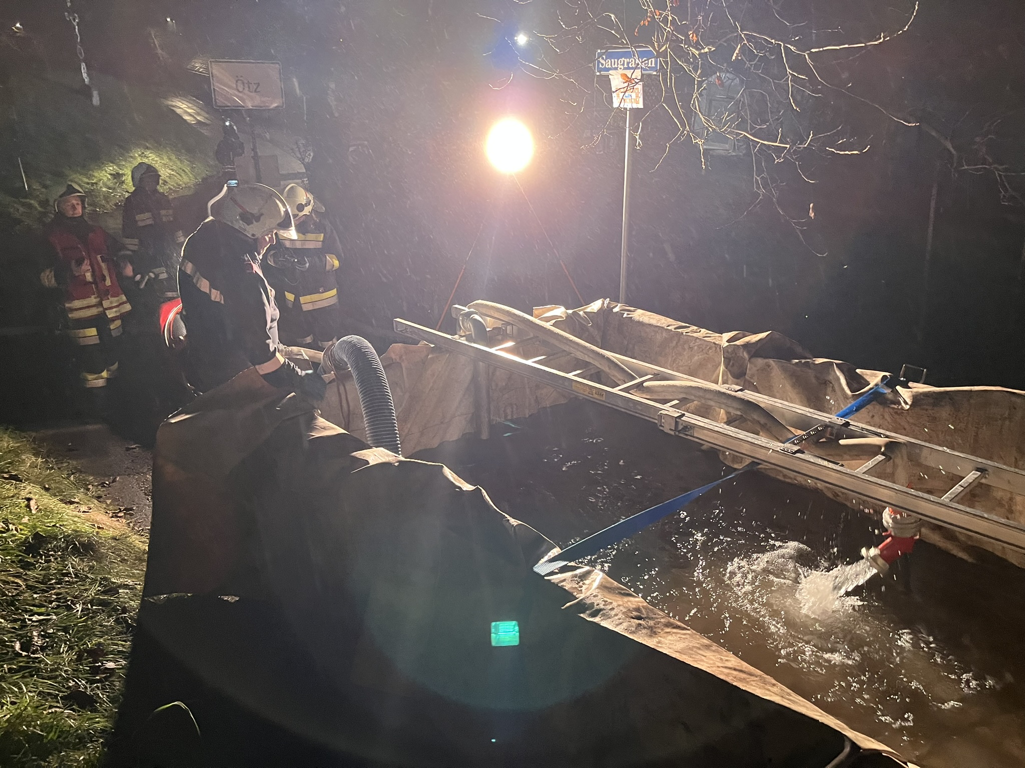 So konnte das Löschbecken rasch mit Wasser aus dem fließenden Gewässer gefüllt und die beiden Tanklöschfahrzeuge kontinuierlich mit Löschwasser versorgt werden.